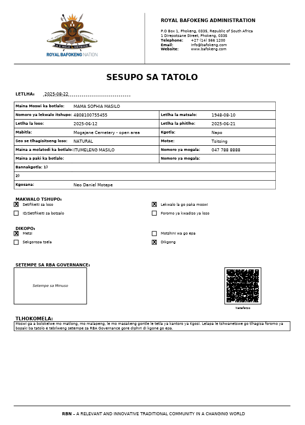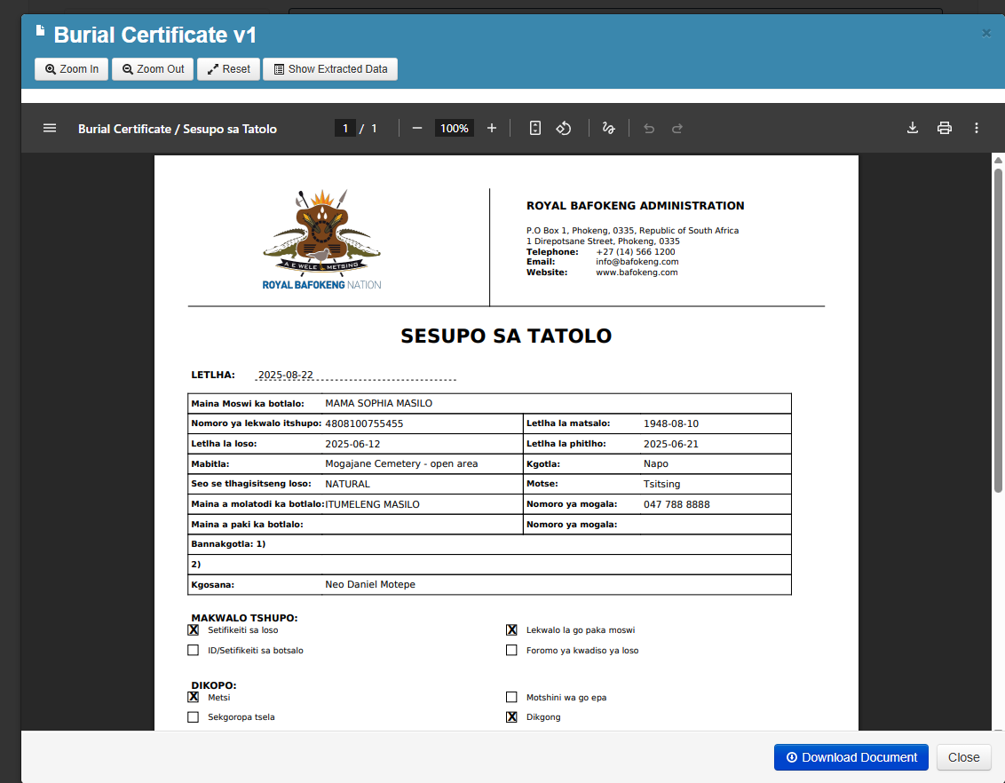 Preview/Download/Print the Burial certificate for you or next of Kin.