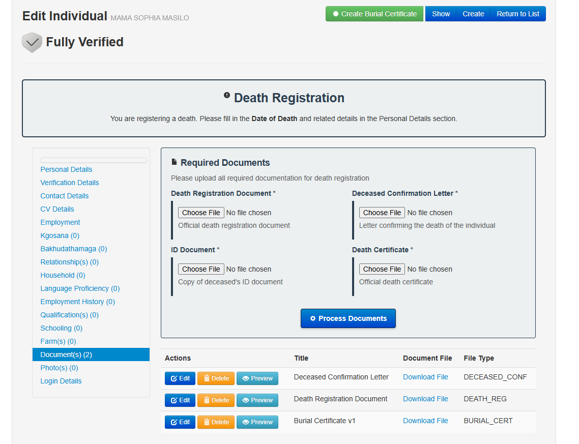 Once the Burial Certificate form is saved the Burial Certificate will be available under the documents tab of the individual.