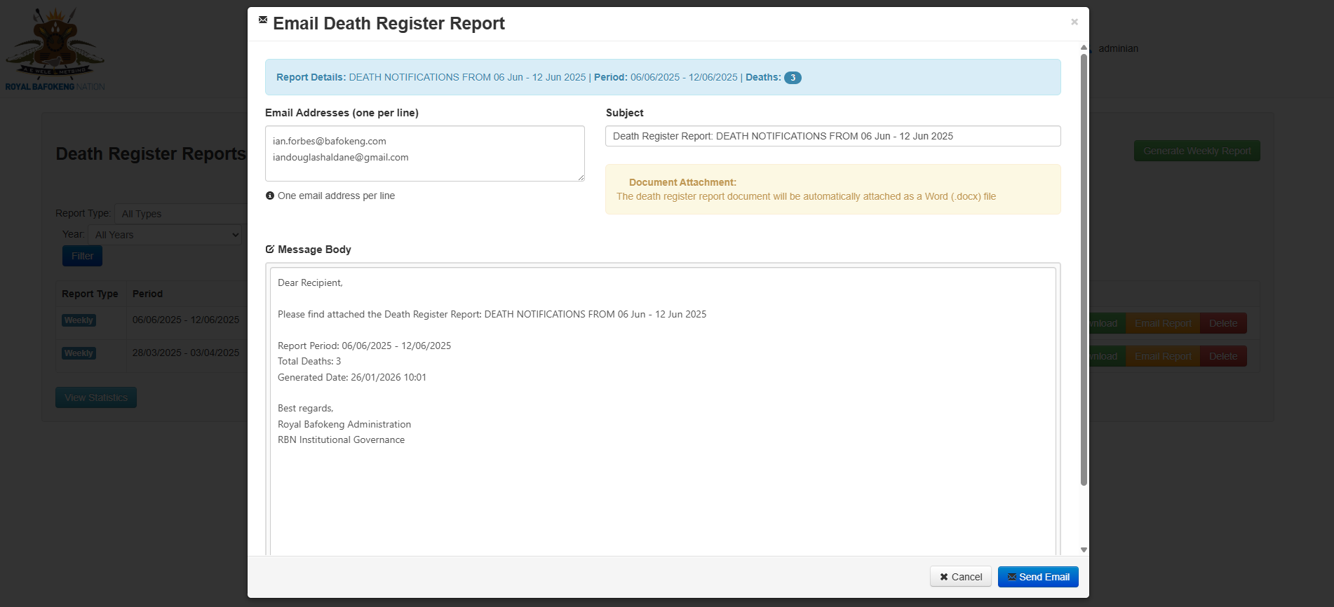 The email form will populate the the standard recipients of the report, any of the email address can be removed or additional emails can be added.