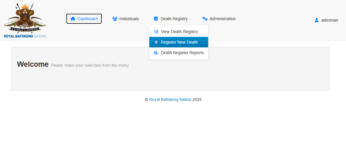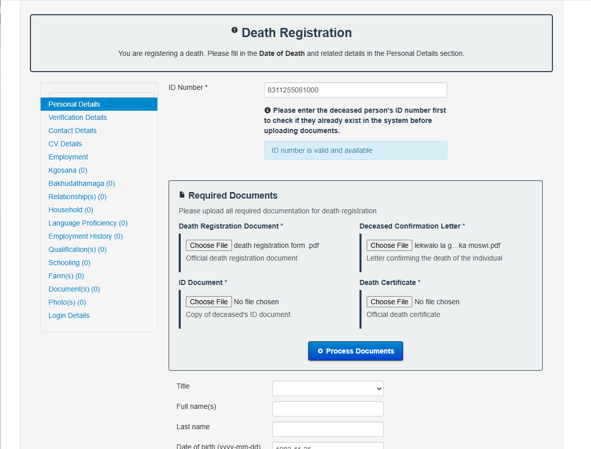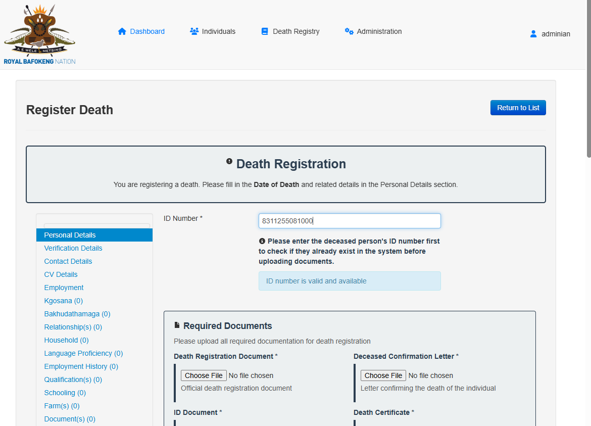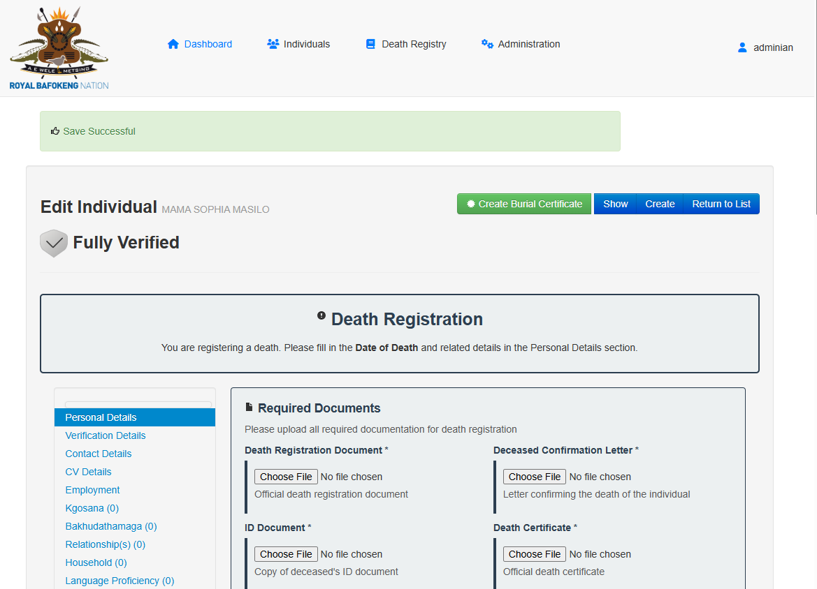 The fields will populate on the Individual form where applicable. Once all the applicable fields have been captured, click on the Save Death Record button.