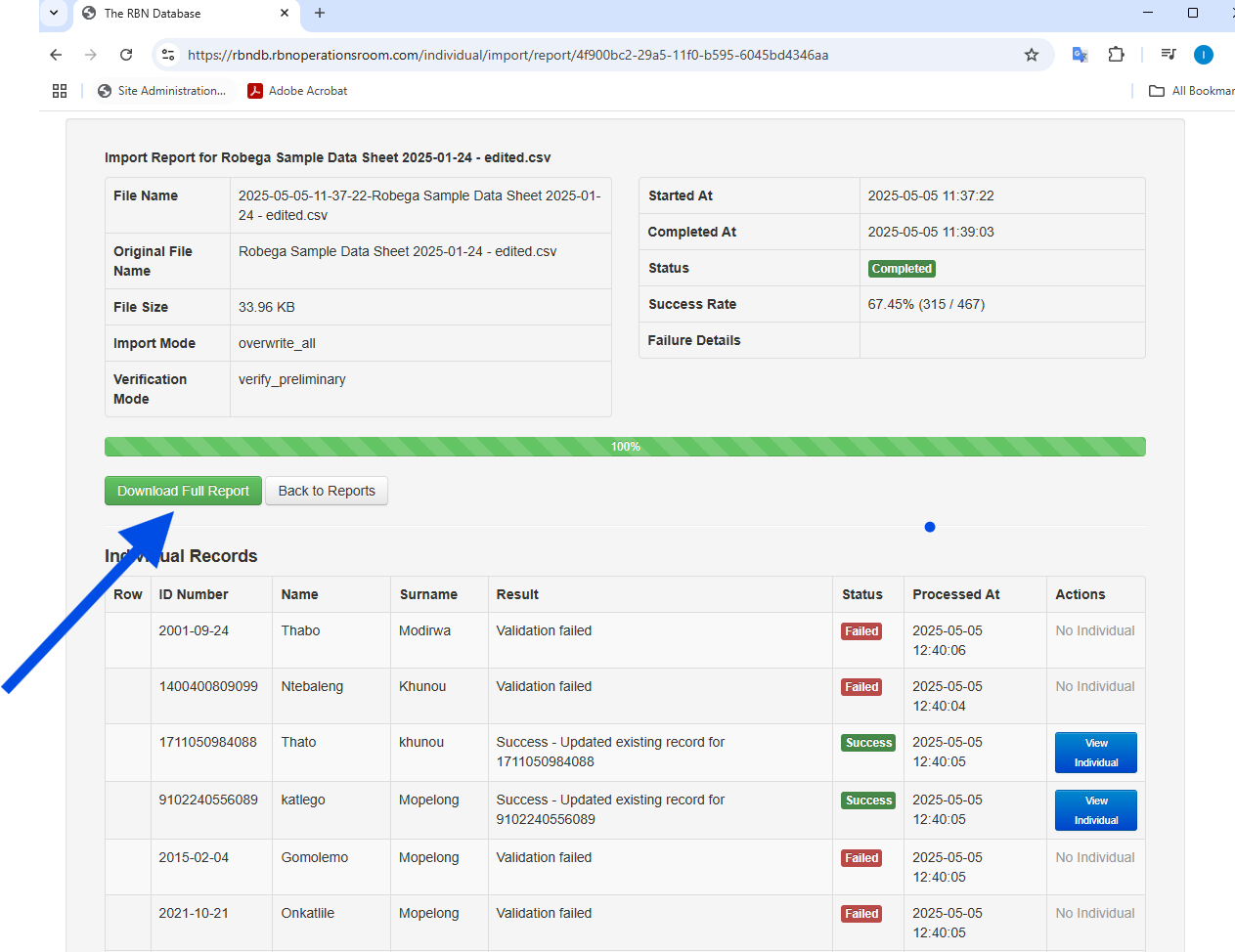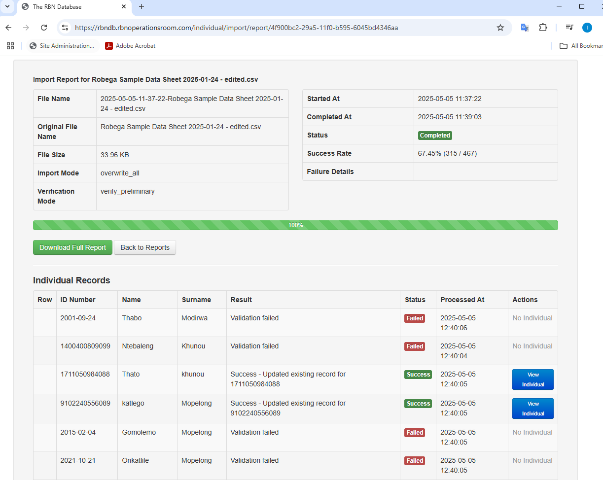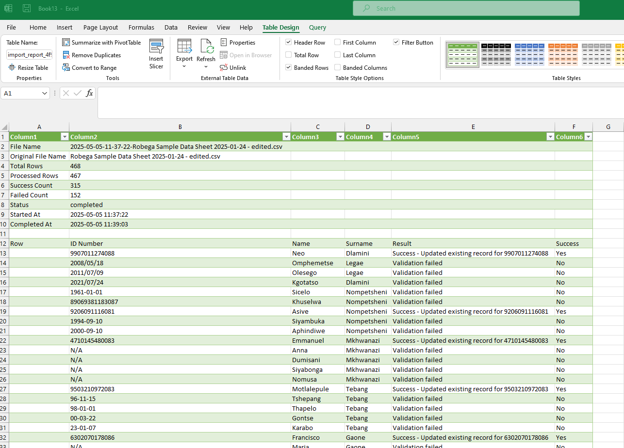The report consists of the ID Number, Name and Surname. The result and status of the import for each record is displayed. There is also button which will take you to the linked individual on the system for verification.